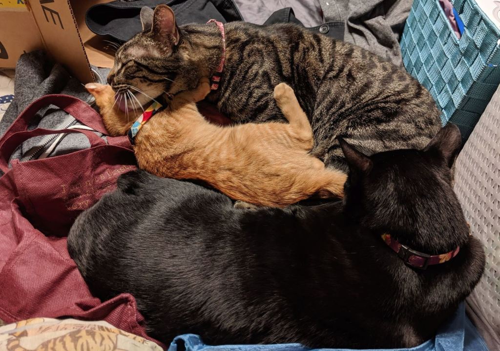 We’re a family of geeks. We love Star Wars, Star Trek, DC and Marvel film franchises (and shows), as well as Doctor Who and Sherlock. We have three cats: Bellatrix Lestrange Rarity Johnson (black/charcoal female tabby), Tonks Dammit Bader Johnson (male brown/grey mackerel tabby), and Ginerva Marie Weasley Johnson (orange tabby).